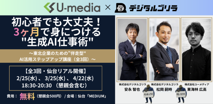株式会社ユーメディアと株式会社デジタルゴリラによる、東北企業の実情に合わせた”徹底伴走型”で学ぶ3ヶ月間連続のAI講座を開催。「生成AI、気にはなっているけれど使いこなせていない」「業務にどう組み込めばいいか分からない」そんな東北の経営者様、DX担当者様、現場担当者様へ基礎から業務活用、そして組織展開まで、ステップアップをサポートします。単発の知識ではなく、3ヶ月間かけて着実にスキルを身につける中で、同じ課題を持つ地域の仲間とつながることができる場ですので、ぜひ奮ってご参加ください。